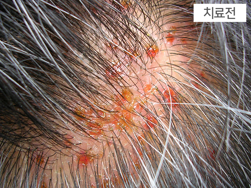 <주소증>- 두피에 발생한 지루성피부염으로 진물과 가피 홍조가 심한 상태<스킨쿼드>- 간열형<경과>- 한약치료: 3개월- 약침치료: 1회/주