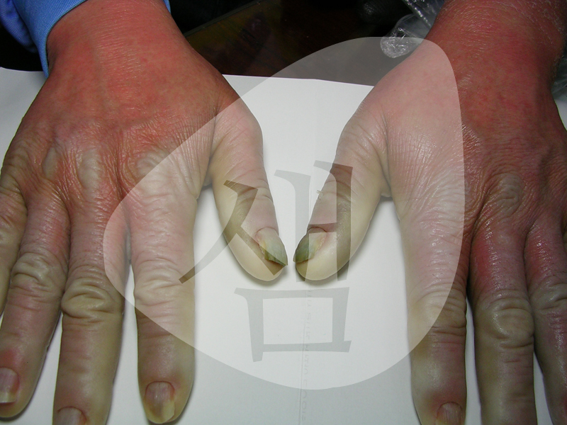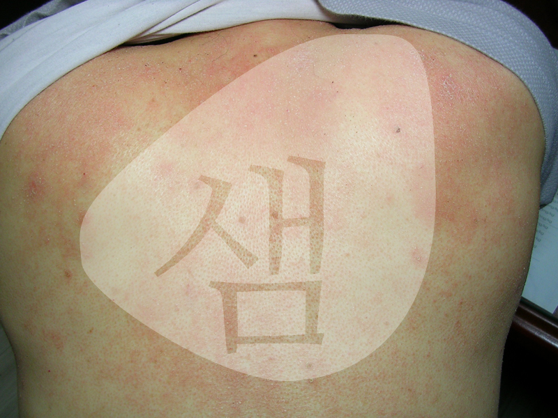 - 전신에 발생한 아토피피부염으로 전신에 소양감, 인설이 심한 병변을 보임몸과 손발 전체로 퍼짐 중증 소견을 보임- 6개월치료후 소실됨