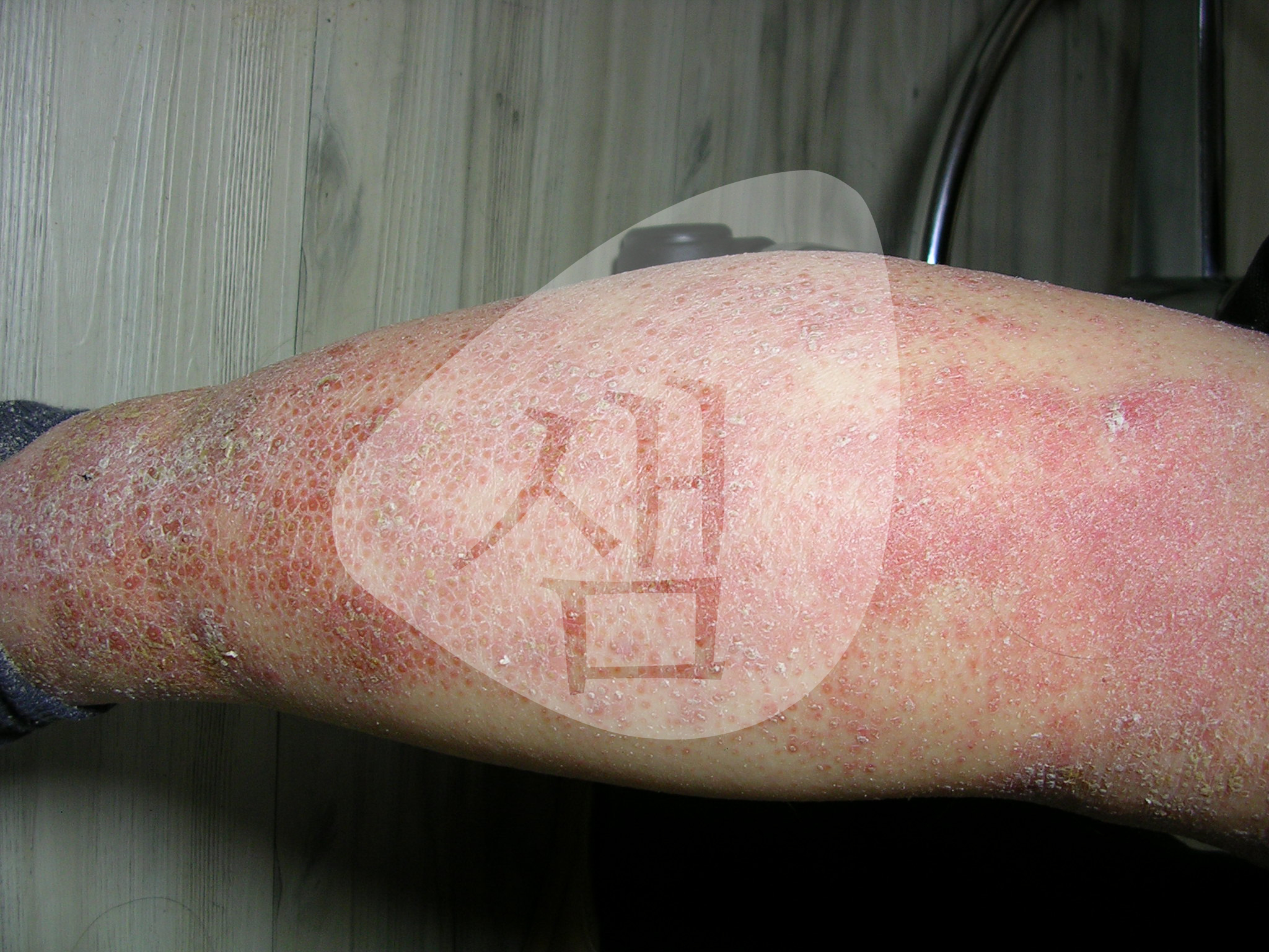 <주소증>- 건선에 의한 전신의 보통 건선이 퍼진상태임.얼굴 머리 등 가슴 다리<스킨쿼드>- 간열형<경과>- 한약치료: 6개월- 약침치료: 1회/2-3주