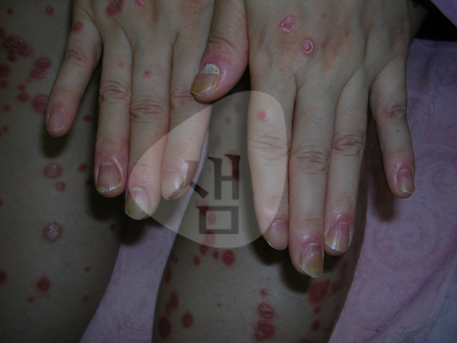 건선 <주소증> - 건선에 의한 얼굴, 팔, 다리, 배, 등으로 퍼진 전신형 건선 건선중 가장 오래 걸리는 손톱 건선이 있는 경우임 <스킨쿼드> - 위열형 비한