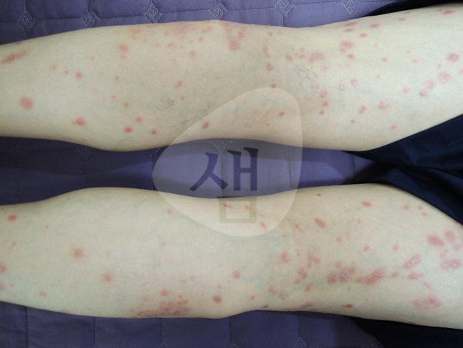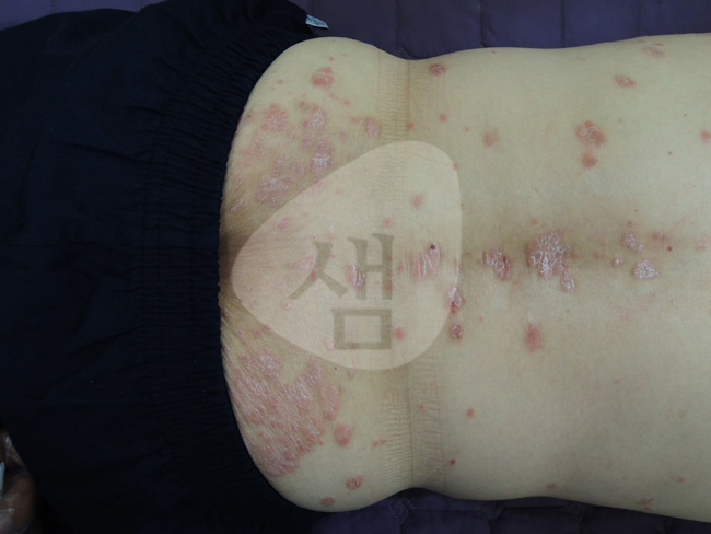 건선 <주소증> - 건선에 의한 얼굴, 팔, 다리, 등, 배의 건선 병변이 전신으로 퍼진 케이스 음주를 지나치게 좋아하는 유형으로 치료시 금주가 필수임 <스