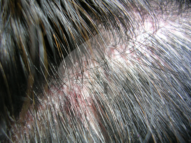 - 지루성피부염에 의한 두피의 습진형 가피형 병변을 보임