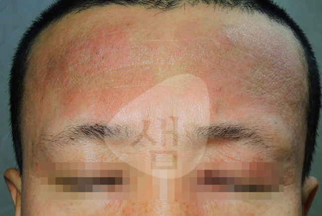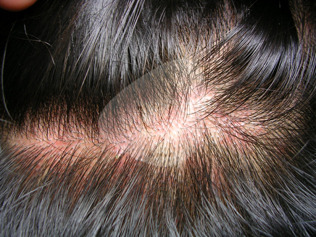 - 지루성피부염에 의한 두피의 병변으로 습진형 홍조형