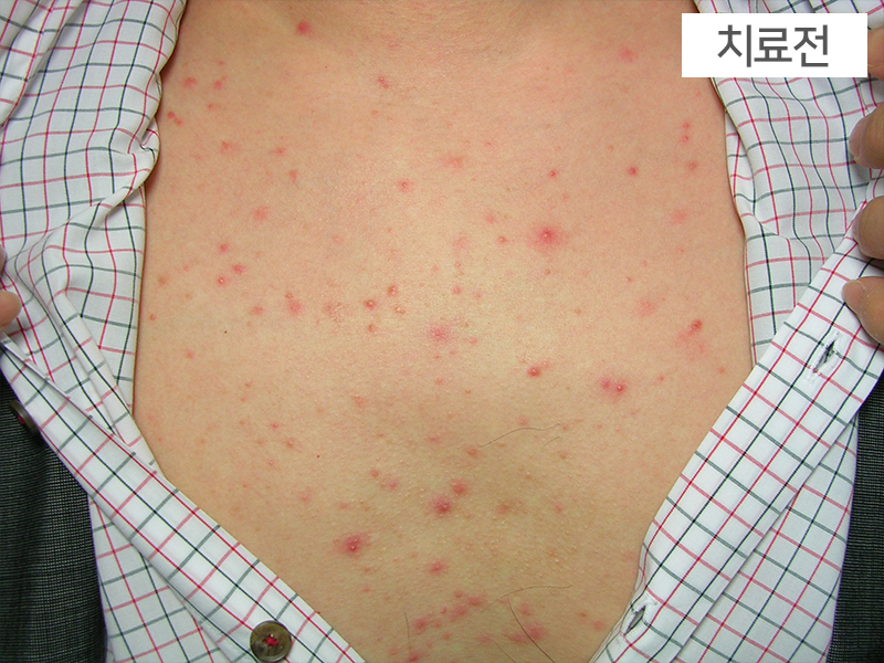 <주소증>- 얼굴과 몸에 발생한 지루성피부염으로 구진형 타입에 속함모낭염도 발생하는 중증형 타입<스킨쿼드>- 위열형<경과>- 한약치료: 3개월- 약침치료: 1회/2-4