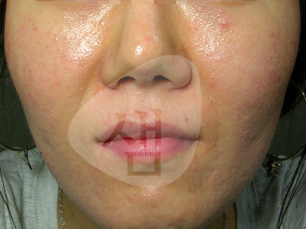 - 얼굴에 발생한 피부염으로 인해서 구진이 많이 돋아난 상태임.