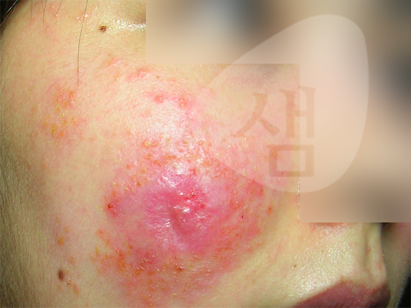 - 상기 환자는 안면부에 발생한 습진형 감염형 지루성피부염으로 소양감과 홍반이 퍼진 형태 - 지루성피부