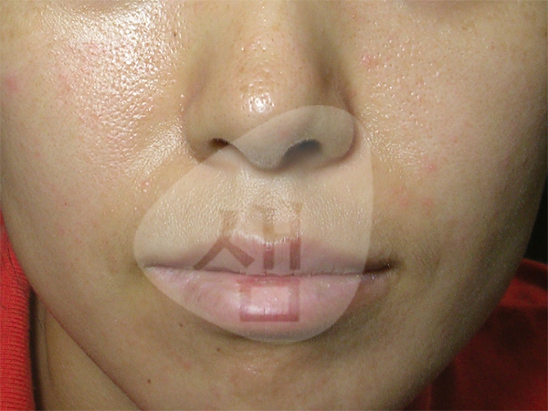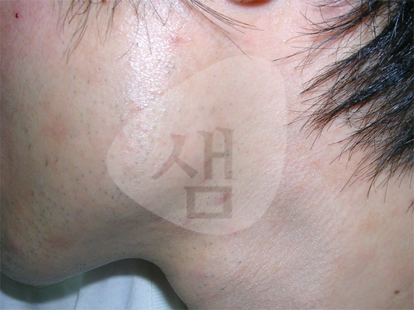 - 여드름 소견은 전혀 없는 상태로 지루성발진이 얼굴에 퍼진 전형