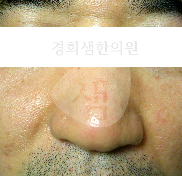 - 얼굴에 발생한 지루성피부염으로 인한 안면홍조, 가려움, 각질 - 과거부터 발생했으며 술에 취한 얼굴로 보