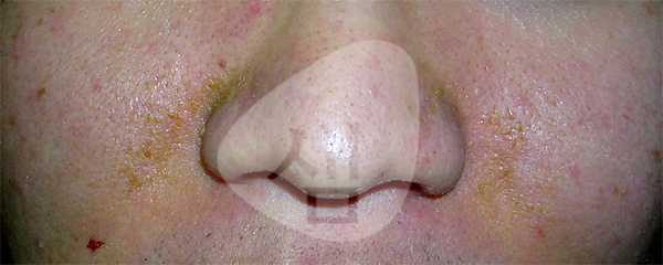 <주소증> - 얼굴에 퍼진 중증 지루성피부염 - 가피가 형성이 되고 습윤한 각질이 침착되어 있는 상태임 - 수년