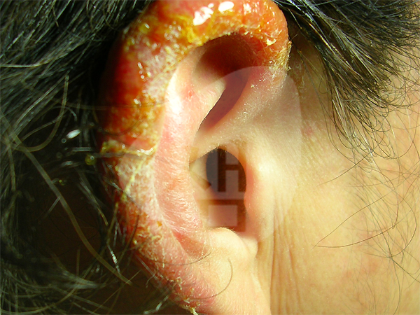 - 안면부에 발생한 전형적인 지루성피부염 양상임 - 지루성피부염중 귀에 발생할 경우 외부적인 자극에 매우