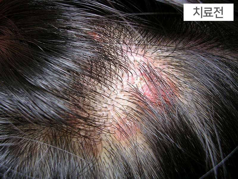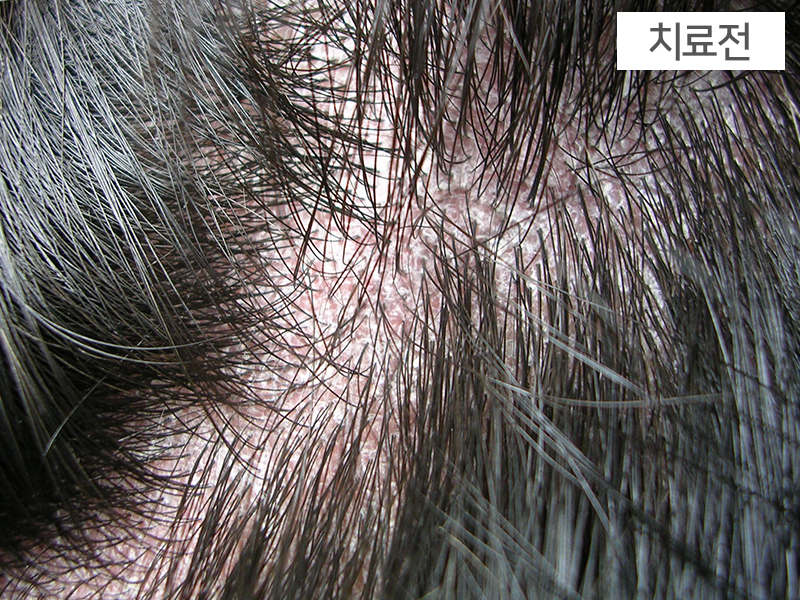 <주소증>- 두피에 발생한 지루성피부염으로 두피의 홍조가 전체적으로 퍼진 형태- 두피 전체로 가피가 심하고 비듬이 매우 심한 경우<스킨쿼드>- 간열폐조형<경과>- 한약